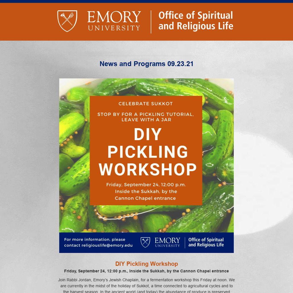 Join Rabbi Jordan, Emory’s Jewish Chaplain, for a fermentation workshop this Friday at noon. We are currently in the midst of the holiday of Sukkot, a time connected to agricultural cycles and to the harvest season. In the ancient world (and today) the abundance of produce is preserved through pickling. Stop by for a quick tutorial on making pickles through lactofermentation and leave with your own small jar of kosher dills. No prior pickling experience required.