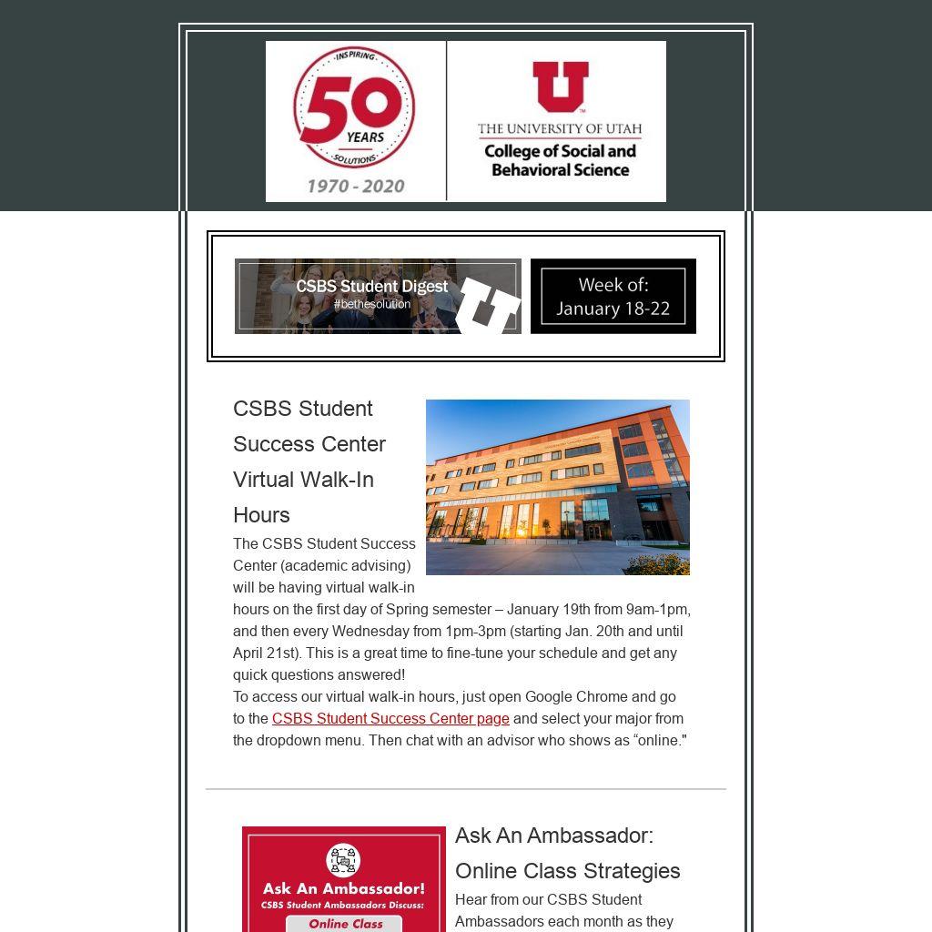 CSBS Student Success Center Virtual Walk-In HoursThe CSBS Student Success Center (academic advising) will be having virtual walk-in hours on the first day of Spring semester – January 19th from 9am-1pm, and then every Wednesday from 1pm-3pm (starting Jan. 20th and until April 21st). This is a great time to fine-tune your schedule and get any quick questions answered! To access our virtual walk-in hours, just open Google Chrome and go to the CSBS Student Success Center page and select your major from the dropdown menu. Then chat with an advisor who shows as “online."