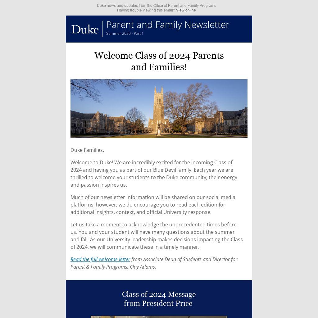 Welcome to Duke! We are incredibly excited for the incoming Class of 2024 and having you as part of our Blue Devil family. Each year we are thrilled to welcome your students to the Duke community; their energy and passion inspires us.