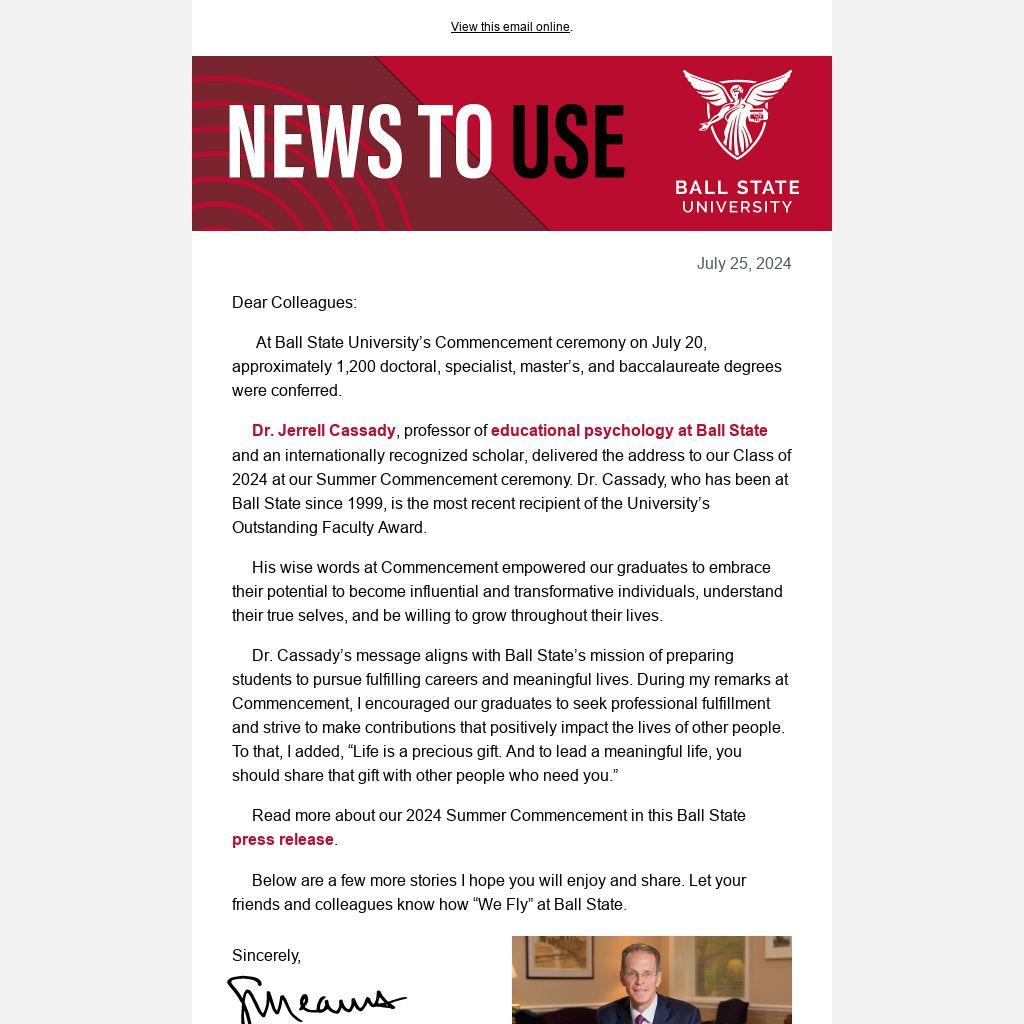 Dr. Cassady’s message aligns with Ball State’s mission of preparing students to pursue fulfilling careers and meaningful lives. During my remarks at Commencement, I encouraged our graduates to seek professional fulfillment and strive to make contributions that positively impact the lives of other people. To that, I added, “Life is a precious gift. And to lead a meaningful life, you should share that gift with other people who need you.”