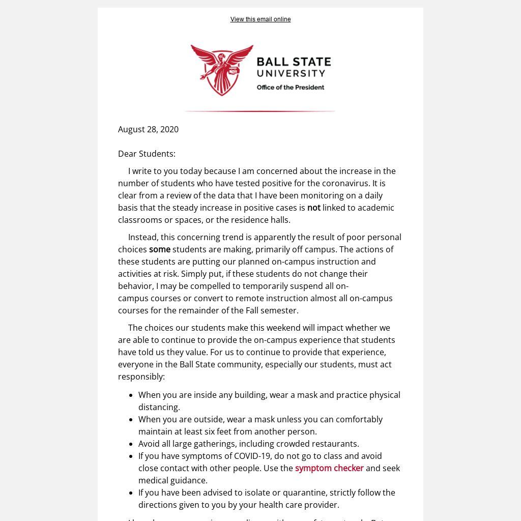 The choices our students make this weekend will impact whether we are able to continue to provide the on-campus experience that students have told us they value. For us to continue to provide that experience, everyone in the Ball State community, especially our students, must act responsibly: