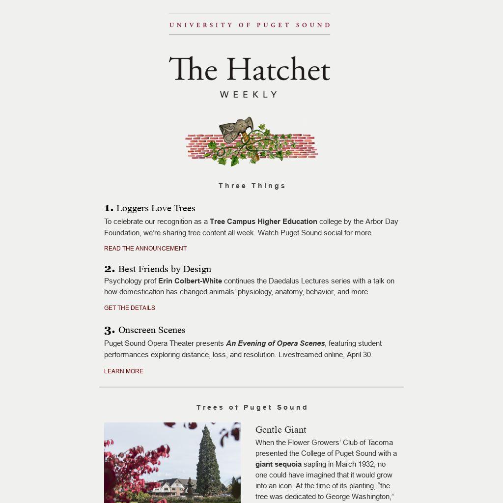 When the Flower Growers’ Club of Tacoma presented the College of Puget Sound with a giant sequoia sapling in March 1932, no one could have imagined that it would grow into an icon. At the time of its planting, “the tree was dedicated to George Washington,” noted The Trail, “and will be left where it is at present unless it becomes too large for the location.” Native to the Sierra Nevada, the giant sequoia now stands on the lawn between Howarth Hall and Wheelock Student Center. At 120 feet tall and 107 inches in diameter, it is by far the largest of Puget Sound’s 13 giant sequoias.