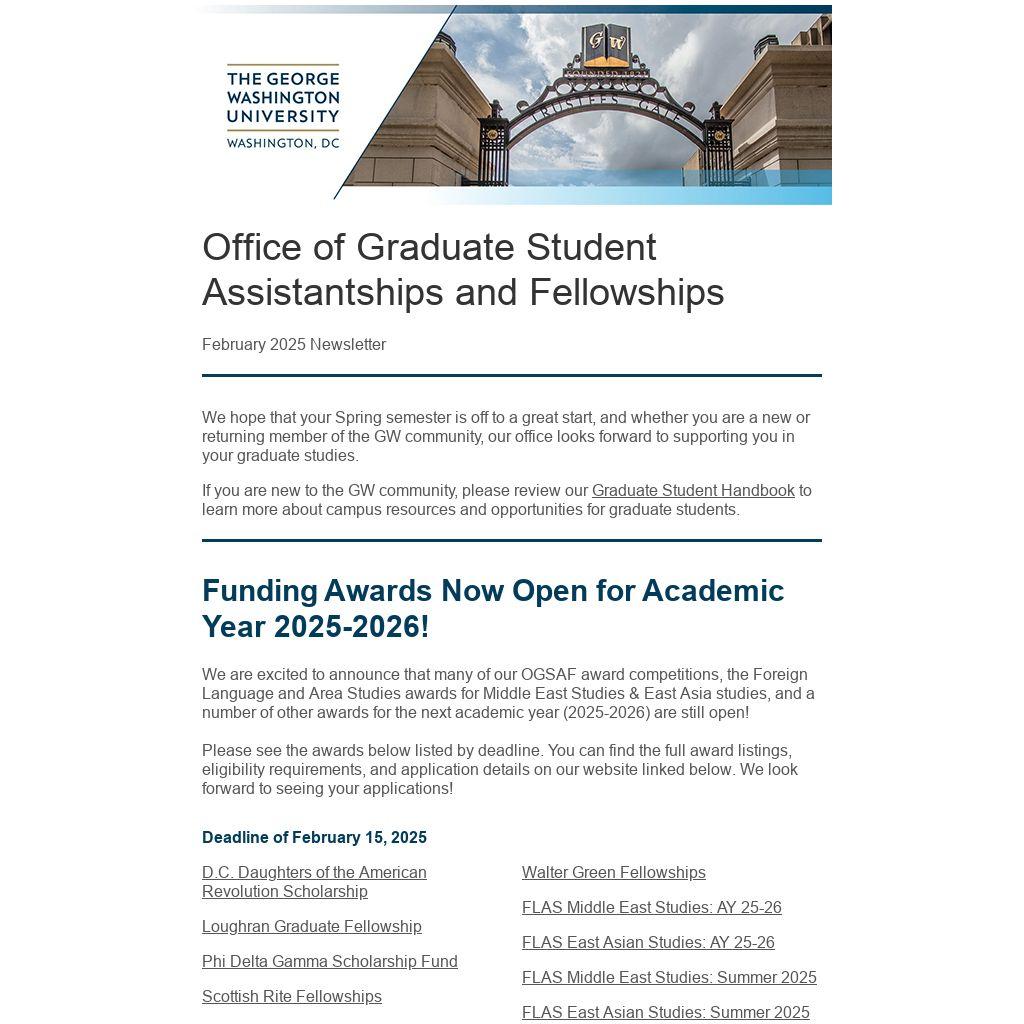 We hope that your Spring semester is off to a great start, and whether you are a new or returning member of the GW community, our office looks forward to supporting you in your graduate studies.