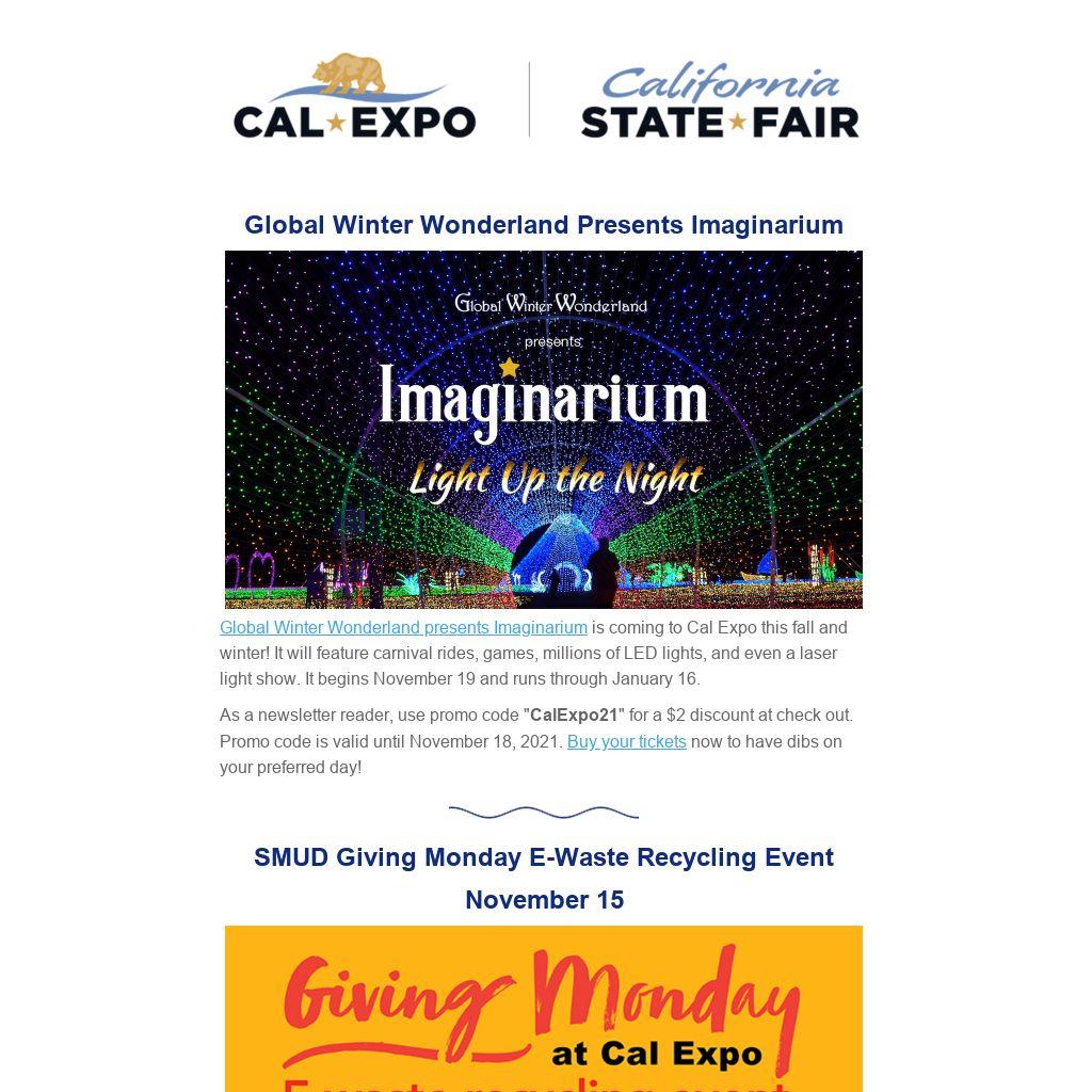 Global Winter Wonderland presents Imaginarium is coming to Cal Expo this fall and winter! It will feature carnival rides, games, millions of LED lights, and even a laser light show. It begins November 19 and runs through January 16.