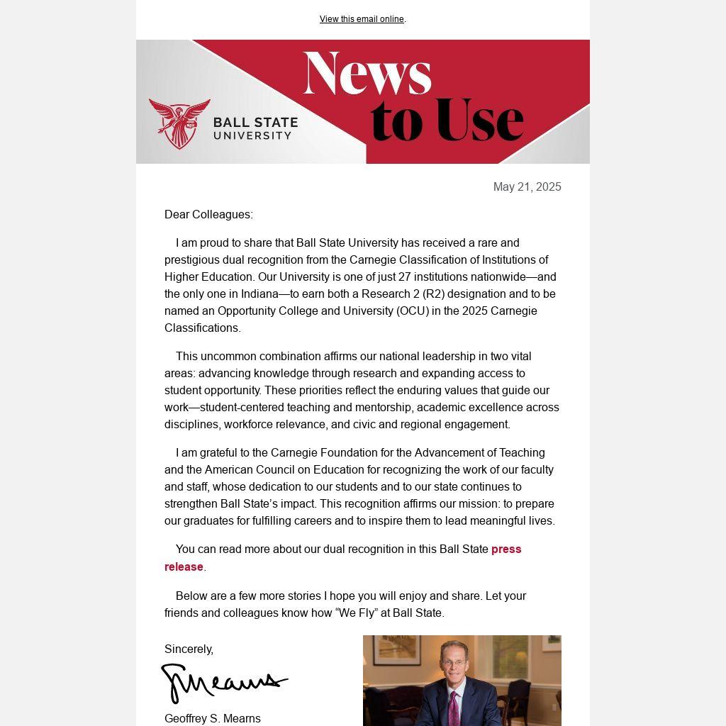 I am proud to share that Ball State University has received a rare and prestigious dual recognition from the Carnegie Classification of Institutions of Higher Education. Our University is one of just 27 institutions nationwide—and the only one in Indiana—to earn both a Research 2 (R2) designation and to be named an Opportunity College and University (OCU) in the 2025 Carnegie Classifications.