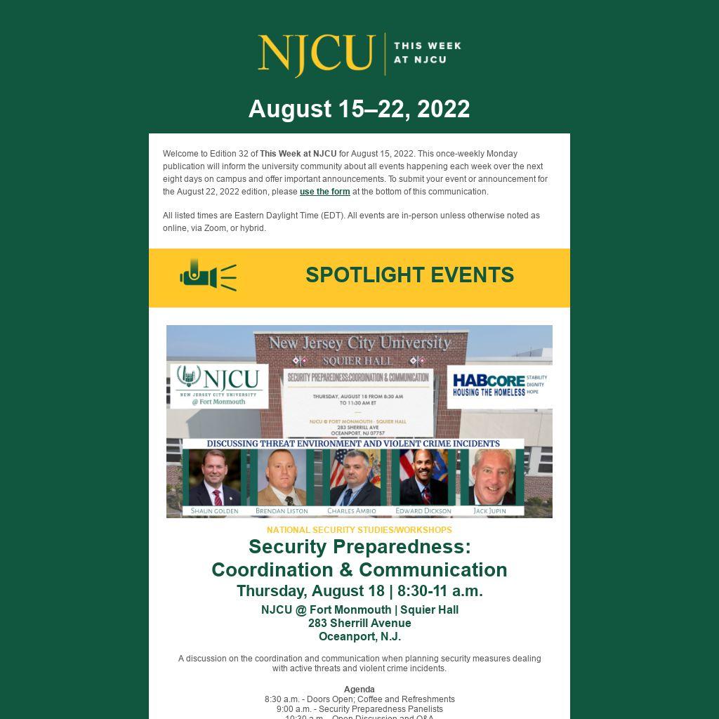 Welcome to Edition 32 of This Week at NJCU for August 15, 2022. This once-weekly Monday publication will inform the university community about all events happening each week over the next eight days on campus and offer important announcements. To submit your event or announcement for the August 22, 2022 edition, please use the form at the bottom of this communication.