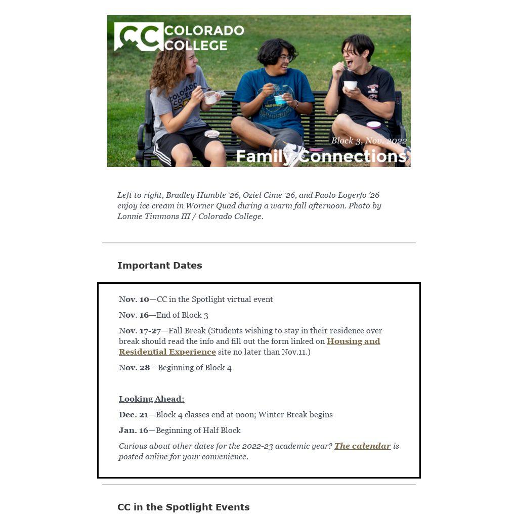 If you haven't been on campus this fall to pick up a copy of the 2022-23 Colorado College wall calendar, we'll be glad to send you one! This beautiful parent/family handbook and calendar is provided by the Office of Alumni and Family Relations as a way to help keep you connected to campus and your student's schedule. If you'd like us to mail your copy, simply fill out the online request form and watch your mailbox for delivery.