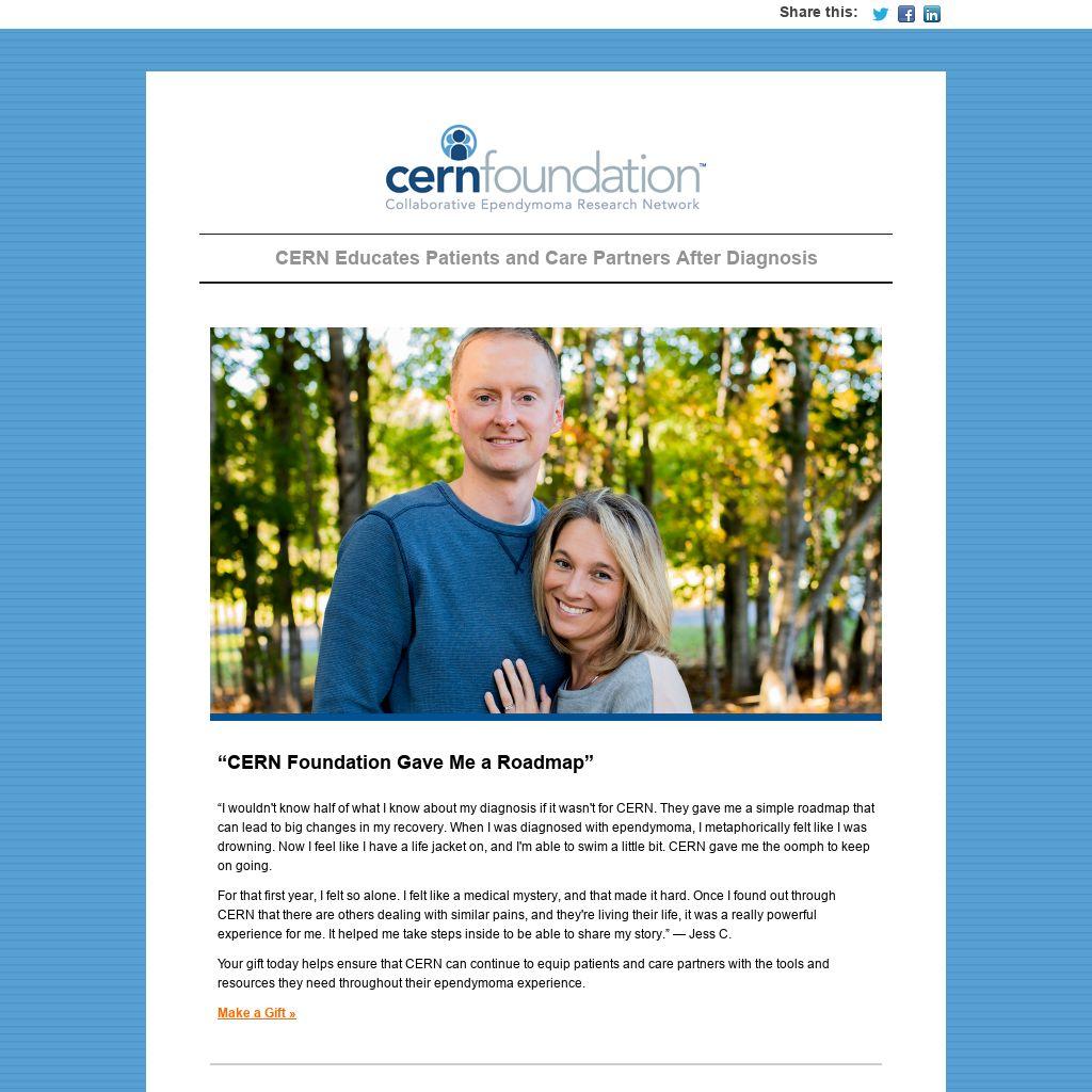 “I wouldn't know half of what I know about my diagnosis if it wasn't for CERN. They gave me a simple roadmap that can lead to big changes in my recovery. When I was diagnosed with ependymoma, I metaphorically felt like I was drowning. Now I feel like I have a life jacket on, and I'm able to swim a little bit. CERN gave me the oomph to keep on going.
