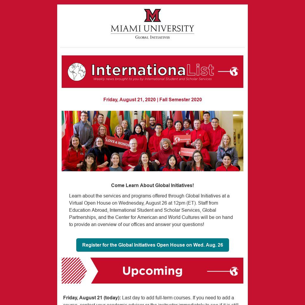 Learn about the services and programs offered through Global Initiatives at a Virtual Open House on Wednesday, August 26 at 12pm (ET). Staff from Education Abroad, International Student and Scholar Services, Global Partnerships, and the Center for American and World Cultures will be on hand to provide an overview of our offices and answer your questions!