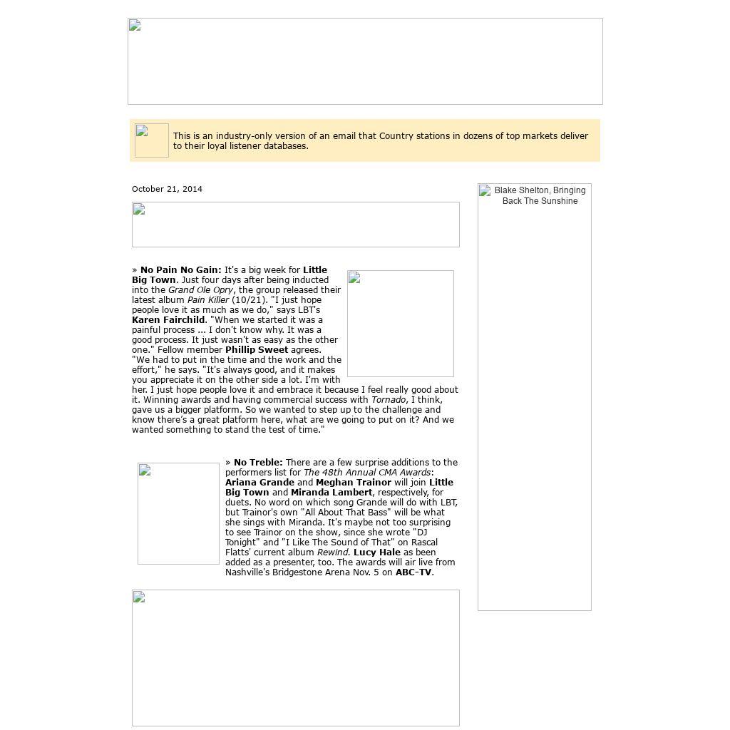 | This is an industry-only version of an email that Country stations in dozens of top markets deliver