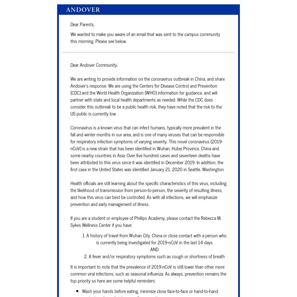 We are writing to provide information on the coronavirus outbreak in China, and share Andover’s response. We are using the Centers for Disease Control and Prevention (CDC) and the World Health Organization (WHO) information for guidance, and will partner with state and local health departments as needed. While the CDC does consider this outbreak to be a public health risk, they have noted that the risk to the US public is currently low.