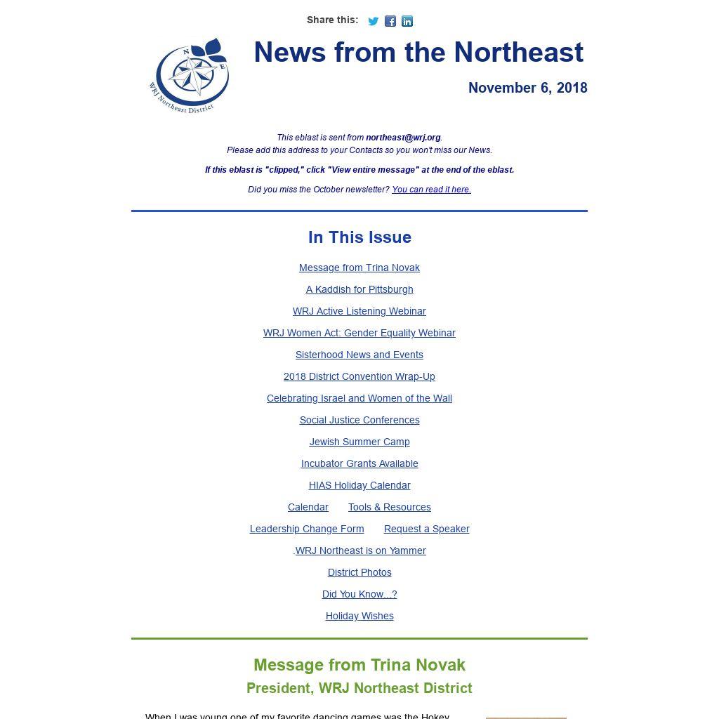 Join the "WRJ Northeast District" group on Yammer, where you can ask questions, learn what's happening, and reconnect with friends in the district. Not on Yammer yet? Then contact Heather Lorgeree in the WRJ office at 212-650-4063, or email her at leadership@wrj.org, for an invitation to Yammer.