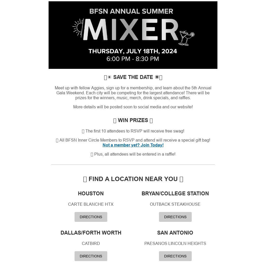 Meet up with fellow Aggies, sign up for a membership, and learn about the 5th Annual Gala Weekend. Each city will be competing for the largest attendance! There will be prizes for the winners, music, merch, drink specials, and raffles.