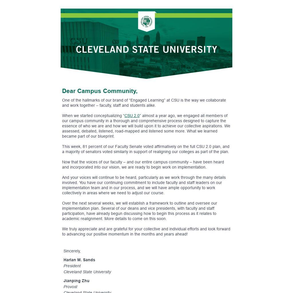 This week, 81 percent of our Faculty Senate voted affirmatively on the full CSU 2.0 plan, and a majority of senators voted similarly in support of realigning our colleges as part of the plan.