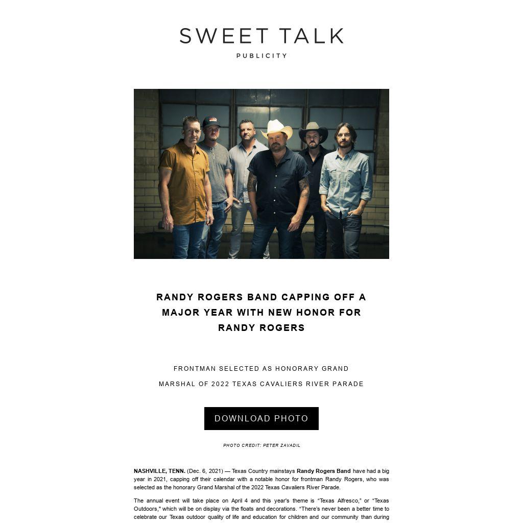 NASHVILLE, TENN. (Dec. 6, 2021) — Texas Country mainstays Randy Rogers Band have had a big year in 2021, capping off their calendar with a notable honor for frontman Randy Rogers, who was selected as the honorary Grand Marshal of the 2022 Texas Cavaliers River Parade.