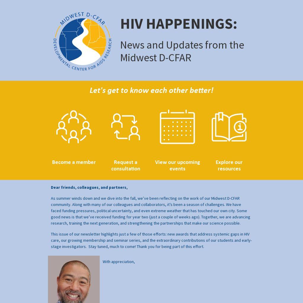 As summer winds down and we dive into the fall, we’ve been reflecting on the work of our Midwest D-CFAR community. Along with many of our colleagues and collaborators, it’s been a season of challenges. We have faced funding pressures, political uncertainty, and even extreme weather that has touched our own city. Some good news is that we’ve received funding for year two (just a couple of weeks ago). Together, we are advancing research, training the next generation, and strengthening the partnerships that make our science possible.