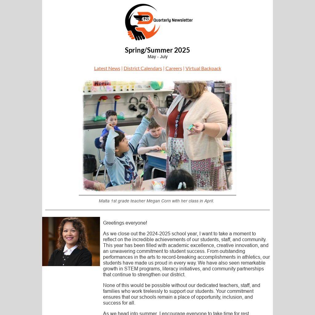As we close out the 2024-2025 school year, I want to take a moment to reflect on the incredible achievements of our students, staff, and community. This year has been filled with academic excellence, creative innovation, and an unwavering commitment to student success. From outstanding performances in the arts to record-breaking accomplishments in athletics, our students have made us proud in every way. We have also seen remarkable growth in STEM programs, literacy initiatives, and community partnerships that continue to strengthen our district.