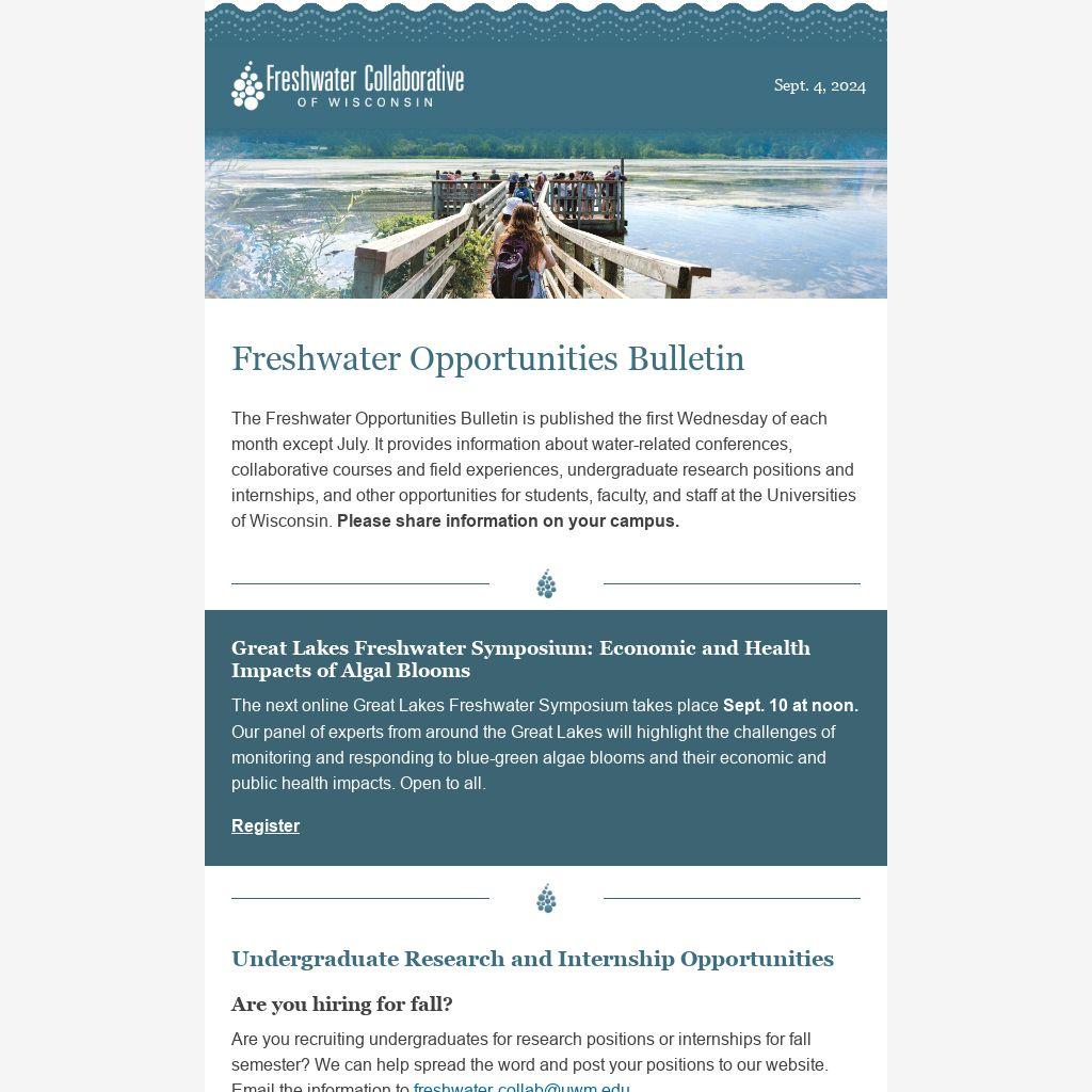 The Freshwater Opportunities Bulletin is published the first Wednesday of each month except July. It provides information about water-related conferences, collaborative courses and field experiences, undergraduate research positions and internships, and other opportunities for students, faculty, and staff at the Universities of Wisconsin. Please share information on your campus.