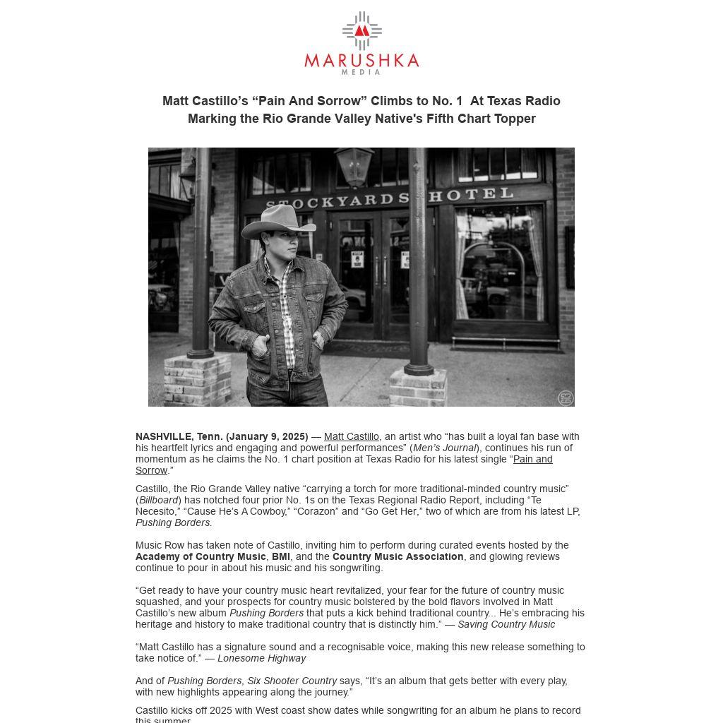 NASHVILLE, Tenn. (January 9, 2025) — Matt Castillo, an artist who “has built a loyal fan base with his heartfelt lyrics and engaging and powerful performances” (Men’s Journal), continues his run of momentum as he claims the No. 1 chart position at Texas Radio for his latest single “Pain and Sorrow.”