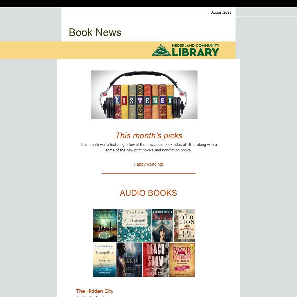 This month's picksThis month we’re featuring a few of the new audio book titles at NCL, along with a some of the new print novels and non-fiction books.
