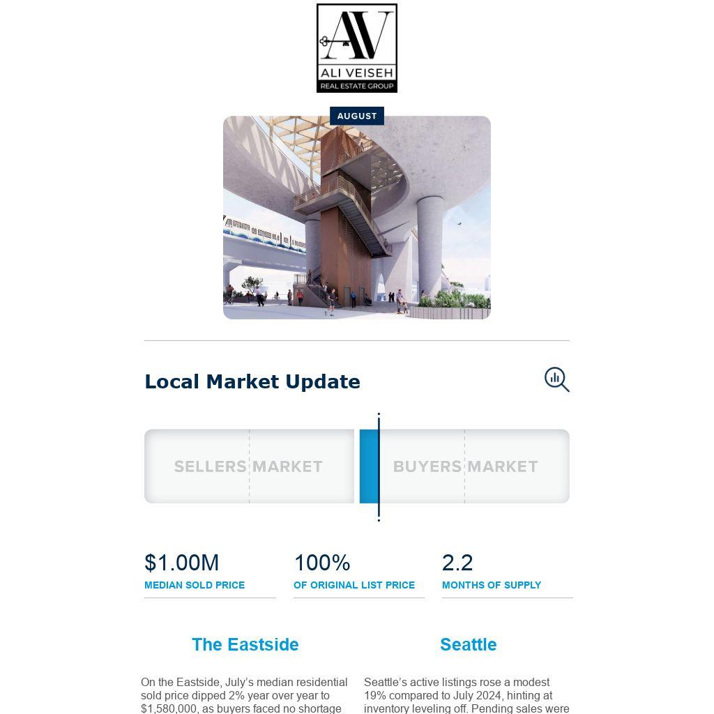 On the Eastside, July’s median residential sold price dipped 2% year over year to $1,580,000, as buyers faced no shortage of options. Pending sales were down 6% and closed sales fell 8%, helping put active listings up 90% from last year to their highest level since 2011. And buyers took advantage — more than 60% of homes sold below asking or after a price change. Meanwhile, Eastside condos held steady at a median sold price of $629,000 and active listings surged 84% from a year prior.