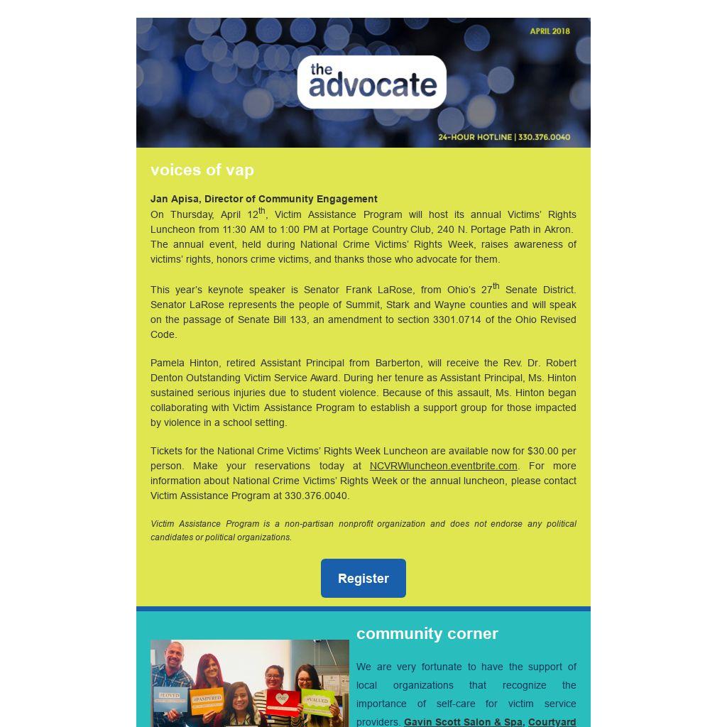 On Thursday, April 12th, Victim Assistance Program will host its annual Victims’ Rights Luncheon from 11:30 AM to 1:00 PM at Portage Country Club, 240 N. Portage Path in Akron. The annual event, held during National Crime Victims’ Rights Week, raises awareness of victims’ rights, honors crime victims, and thanks those who advocate for them.