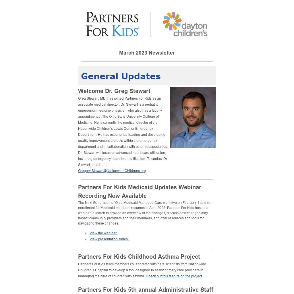 Greg Stewart, MD, has joined Partners For Kids as an associate medical director. Dr. Stewart is a pediatric emergency medicine physician who also has a faculty appointment at The Ohio State University College of Medicine. He is currently the medical director of the Nationwide Children’s Lewis Center Emergency Department. He has experience leading and developing quality improvement projects within the emergency department and in collaboration with other subspecialties. Dr. Stewart will focus on advanced healthcare utilization, including emergency department utilization. To contact Dr. Stewart, email Gregory.Stewart@NationwideChildrens.org.