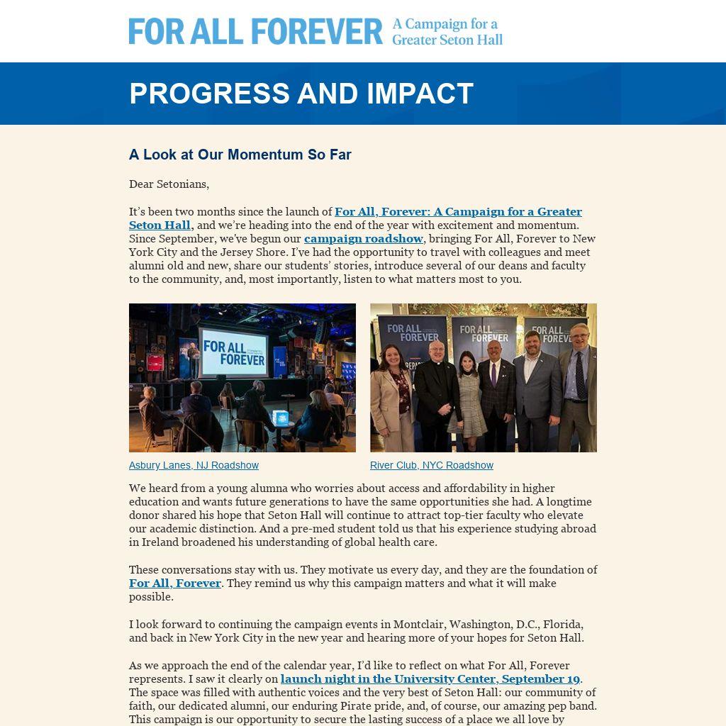 It’s been two months since the launch of For All, Forever: A Campaign for a Greater Seton Hall, and we’re heading into the end of the year with excitement and momentum. Since September, we've begun our campaign roadshow, bringing For All, Forever to New York City and the Jersey Shore. I’ve had the opportunity to travel with colleagues and meet alumni old and new, share our students’ stories, introduce several of our deans and faculty to the community, and, most importantly, listen to what matters most to you.