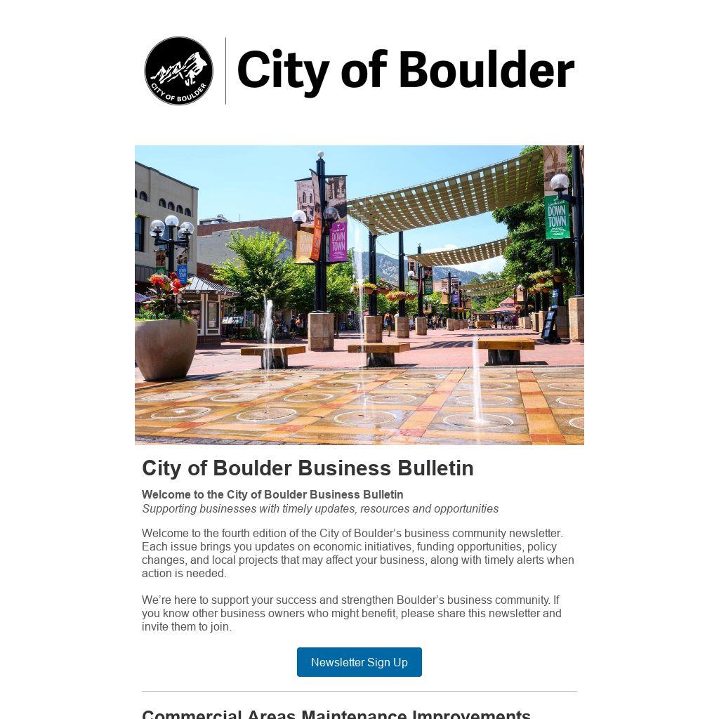 Welcome to the fourth edition of the City of Boulder’s business community newsletter. Each issue brings you updates on economic initiatives, funding opportunities, policy changes, and local projects that may affect your business, along with timely alerts when action is needed.