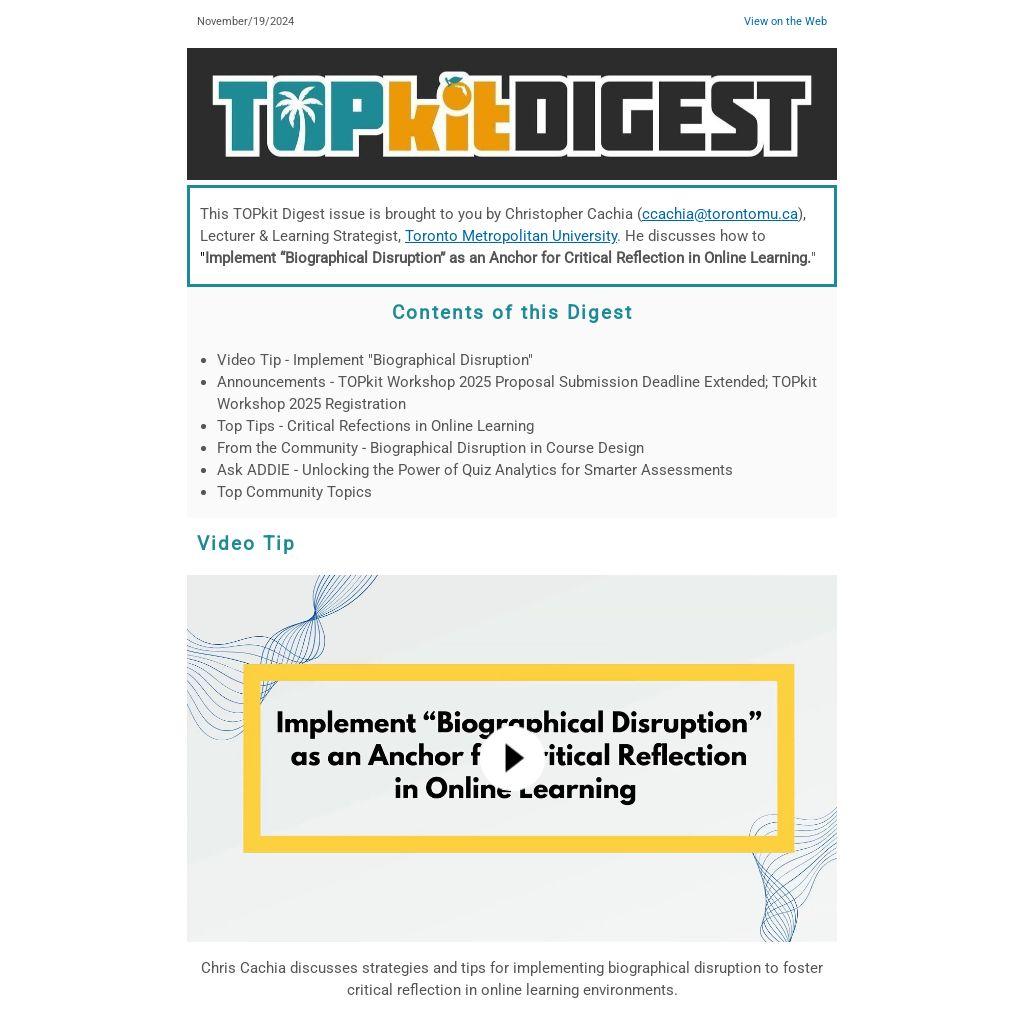 This TOPkit Digest issue is brought to you by Christopher Cachia (ccachia@torontomu.ca), Lecturer & Learning Strategist, Toronto Metropolitan University. He discusses how to "Implement “Biographical Disruption” as an Anchor for Critical Reflection in Online Learning."