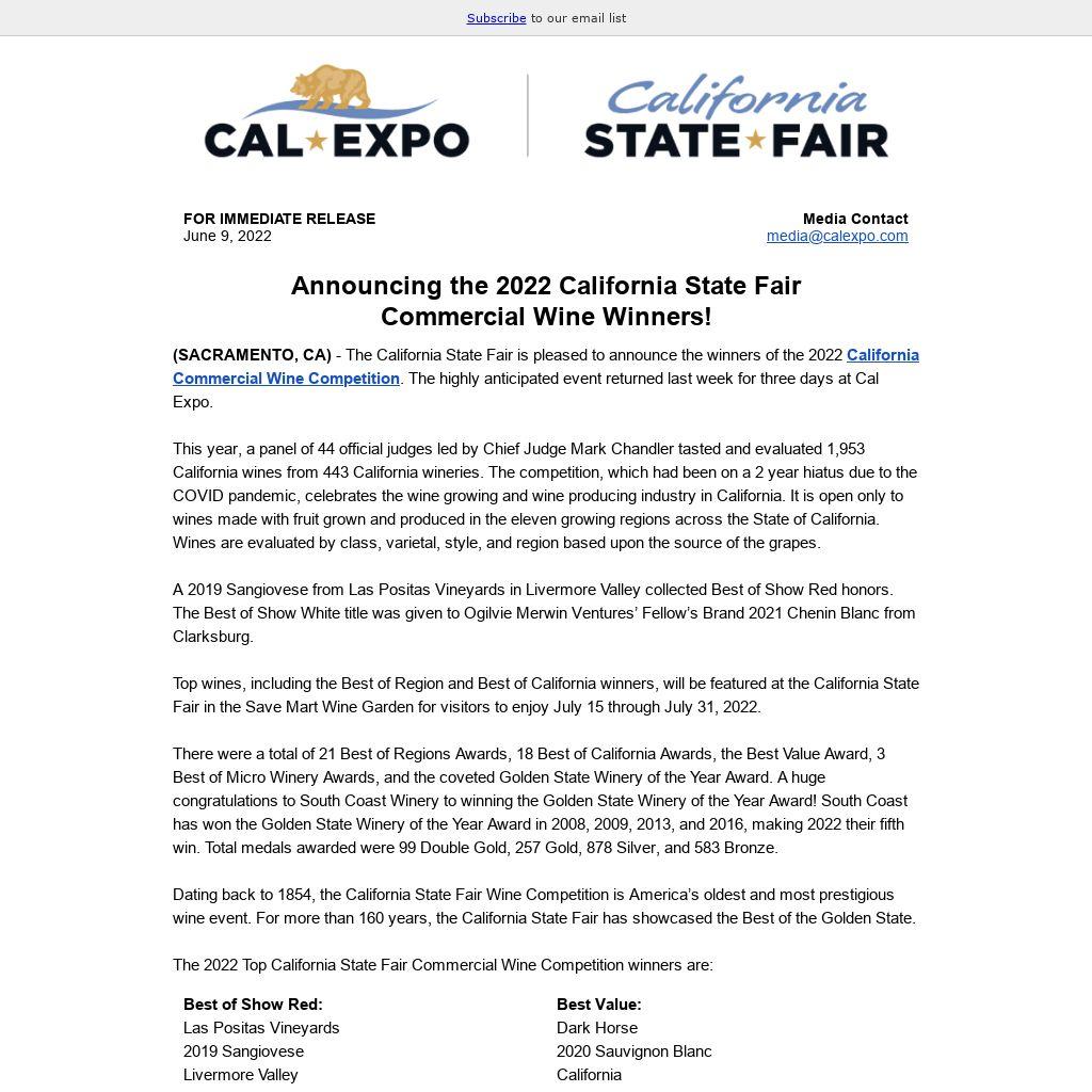 (SACRAMENTO, CA) - The California State Fair is pleased to announce the winners of the 2022 California Commercial Wine Competition. The highly anticipated event returned last week for three days at Cal Expo.
