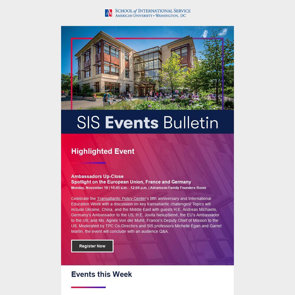 Celebrate the Transatlantic Policy Center’s fifth anniversary and International Education Week with a discussion on key transatlantic challenges! Topics will include Ukraine, China, and the Middle East with guests H.E. Andreas Michaelis, Germany’s Ambassador to the US; H.E. Jovita Neliupšienė, the EU’s Ambassador to the US; and Ms. Agnes Von der Muhll, France’s Deputy Chief of Mission to the US. Moderated by TPC Co-Directors and SIS professors Michelle Egan and Garret Martin, the event will conclude with an audience Q&A.