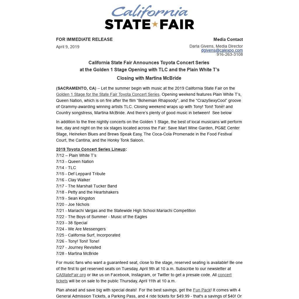 (SACRAMENTO, CA) – Let the summer begin with music at the 2019 California State Fair on the Golden 1 Stage for the State Fair Toyota Concert Series. Opening weekend features Plain White T’s, Queen Nation, which is on fire after the film “Bohemian Rhapsody”, and the “CrazySexyCool” groove of Grammy-awarding winning artists TLC. Closing weekend wraps up with Tony! Toni! Tonè! and Country songstress, Martina McBride. And there’s plenty of good music in between! See below In addition to the free nightly concerts on the Golden 1 Stage, the best of local musicians will perform live, day and night on the six stages located across the Fair: Save Mart Wine Garden, PG&E Center Stage, Heineken Blues and Brews Speak Easy, The Coca-Cola Promenade in the Food Festival Court, the Cantina, and the Honky Tonk Saloon.