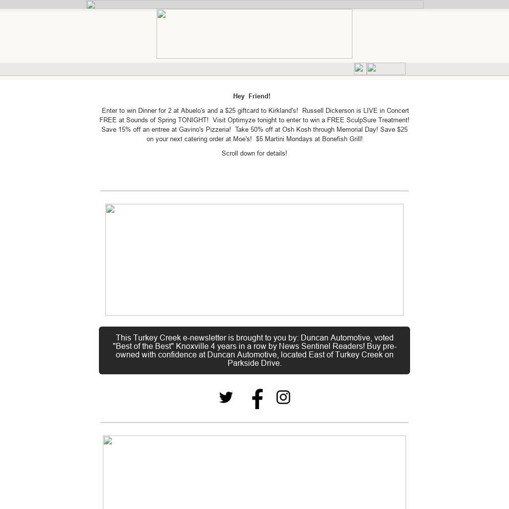 Enter to win Dinner for 2 at Abuelo's and a $25 giftcard to Kirkland's! Russell Dickerson is LIVE in Concert FREE at Sounds of Spring TONIGHT! Visit Optimyze tonight to enter to win a FREE SculpSure Treatment! Save 15% off an entree at Gavino's Pizzeria! Take 50% off at Osh Kosh through Memorial Day! Save $25 on your next catering order at Moe's! $5 Martini Mondays at Bonefish Grill!