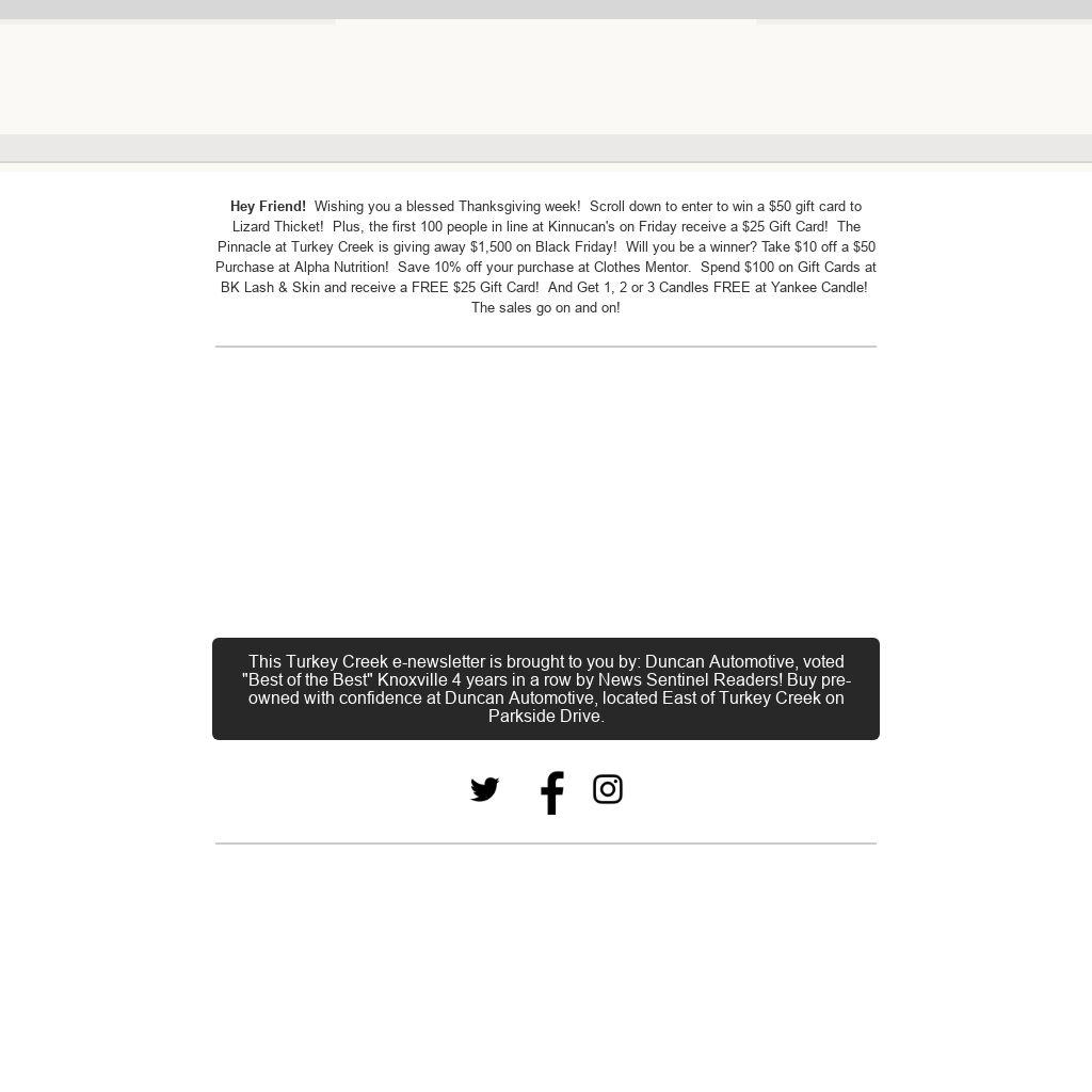 Hey Friend! Wishing you a blessed Thanksgiving week! Scroll down to enter to win a $50 gift card to Lizard Thicket! Plus, the first 100 people in line at Kinnucan's on Friday receive a $25 Gift Card! The Pinnacle at Turkey Creek is giving away $1,500 on Black Friday! Will you be a winner? Take $10 off a $50 Purchase at Alpha Nutrition! Save 10% off your purchase at Clothes Mentor. Spend $100 on Gift Cards at BK Lash & Skin and receive a FREE $25 Gift Card! And Get 1, 2 or 3 Candles FREE at Yankee Candle! The sales go on and on!