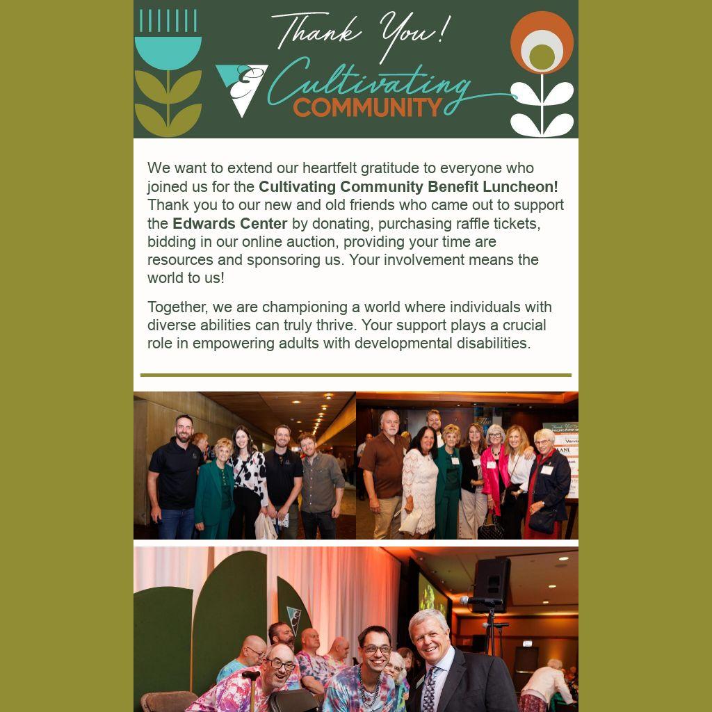 We want to extend our heartfelt gratitude to everyone who joined us for the Cultivating Community Benefit Luncheon! Thank you to our new and old friends who came out to support the Edwards Center by donating, purchasing raffle tickets, bidding in our online auction, providing your time are resources and sponsoring us. Your involvement means the world to us!