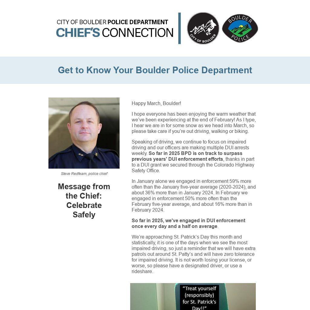 Speaking of driving, we continue to focus on impaired driving and our officers are making multiple DUI arrests weekly. So far in 2025 BPD is on track to surpass previous years' DUI enforcement efforts, thanks in part to a DUI grant we secured through the Colorado Highway Safety Office.