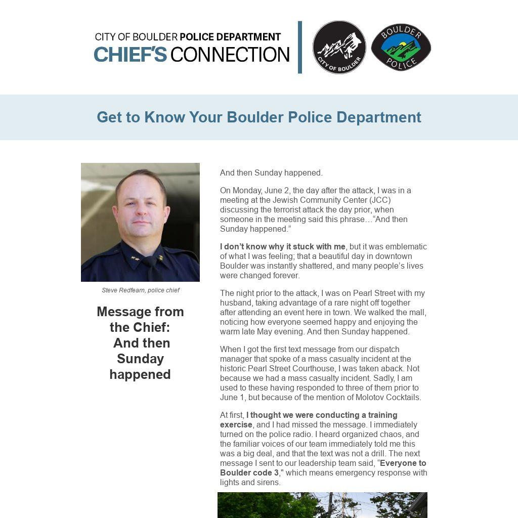 As is normal in this profession, while we were planning events, trying to get a little sleep, and fielding non-stop community emails and calls, we also had a SWAT call with an armed person, demonstrations outside City Council, an incident at NCAR with an armed person, and the usual day-to-day issues that we face. Our team performed as they always do and handled every call like the professionals I know them to be. We knew what we needed to do, and it was to be strong for our community.