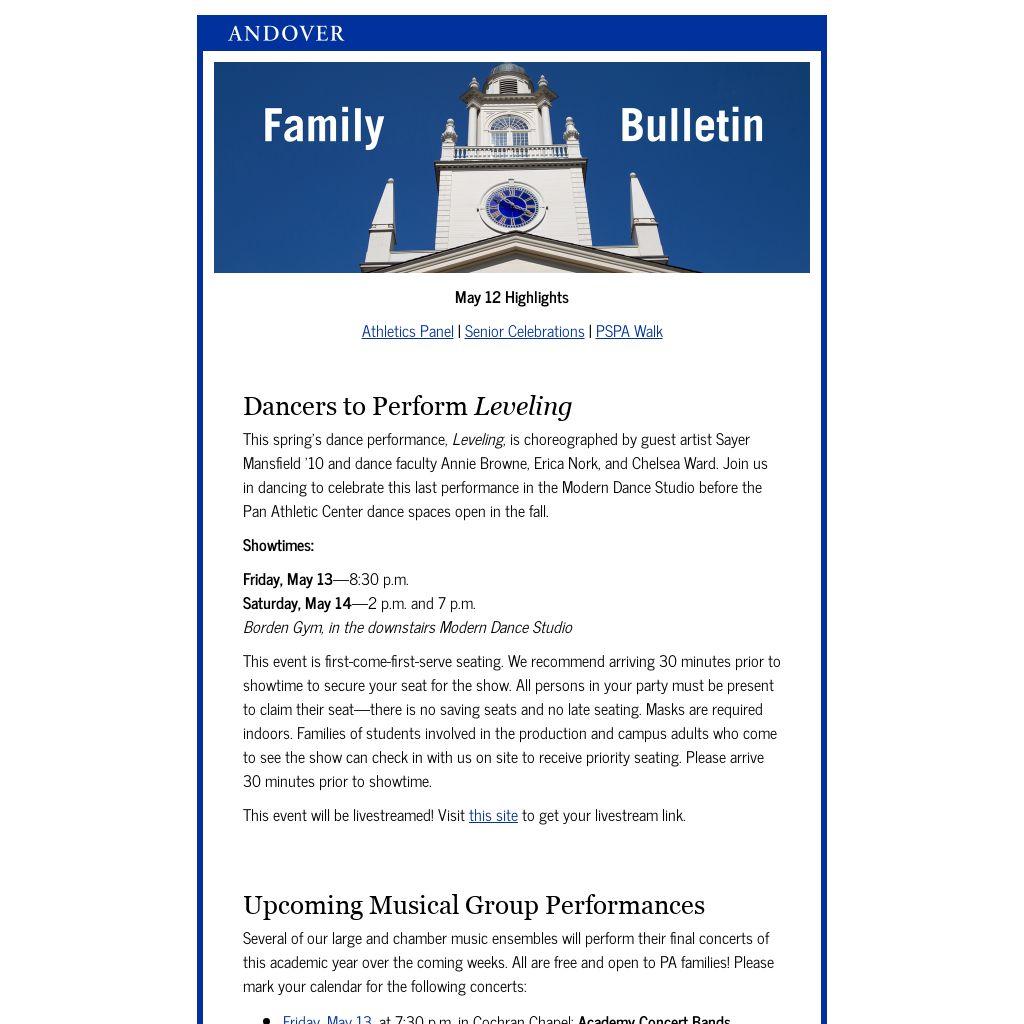 Please check the Events Calendar on Andover’s website regularly for additional in-person and online events that may be open to families. The Weekender is the Academy’s one-stop guide to weekend student activities, opportunities, club-organized events, guest speakers, performances, and athletic contests.