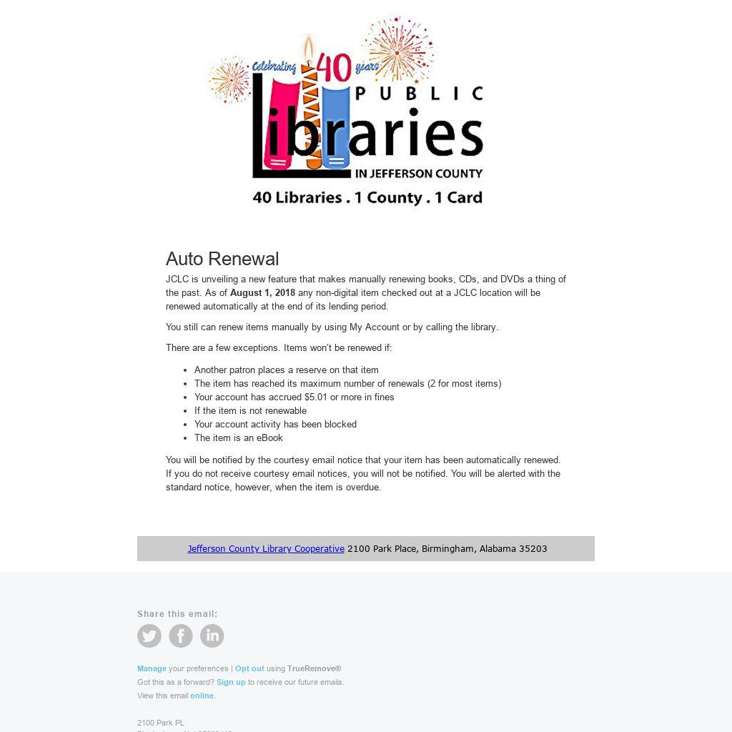 JCLC is unveiling a new feature that makes manually renewing books, CDs, and DVDs a thing of the past. As of August 1, 2018 any non-digital item checked out at a JCLC location will be renewed automatically at the end of its lending period.