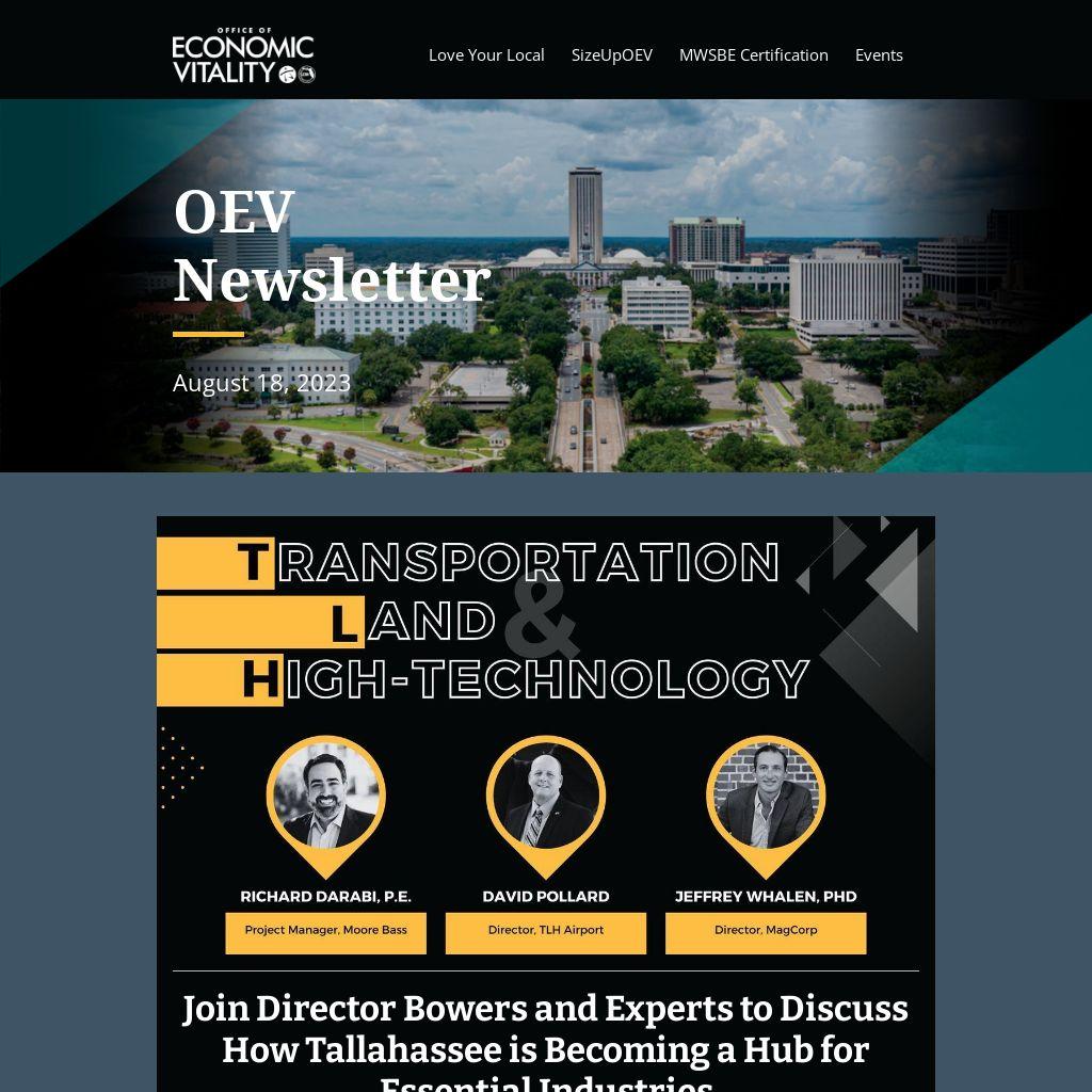 The Office of Economic Vitality (OEV) is the economic development organization for the City of Tallahassee and Leon County. Our economic development model values diversity, equity, and economic inclusion. We assist businesses with navigating & competing in today’s marketplace while leveraging existing resources to maximize the infusion of capital into our community. For more information, visit OEVforBusiness.org