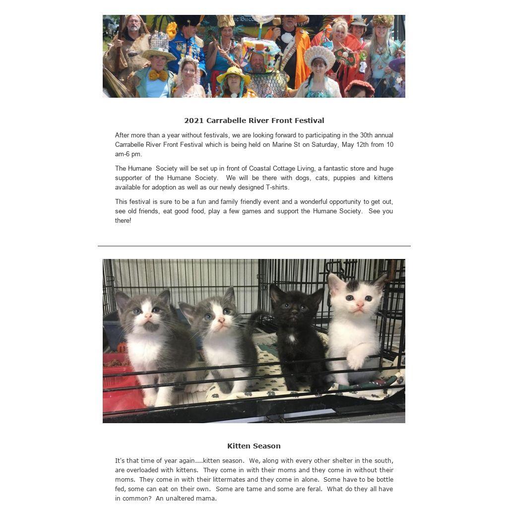 We have donation jars in many businesses throughout the county. That money funds our voucher program so please donate when you see one of our jars. If you would like to mail a donation specifically for the program, please send to: 244 HWY 65, Eastpoint, FL 32328 and make a notation on the memo line.