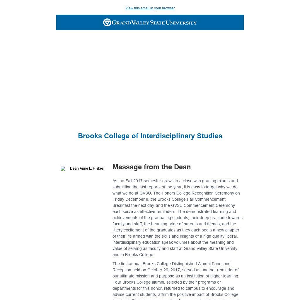 Message from the DeanAs the Fall 2017 semester draws to a close with grading exams and submitting the last reports of the year, it is easy to forget why we do what we do at GVSU. The Honors College Recognition Ceremony on Friday December 8, the Brooks College Fall Commencement Breakfast the next day, and the GVSU Commencement Ceremony each serve as effective reminders. The demonstrated learning and achievements of the graduating students, their deep gratitude towards faculty and staff, the beaming pride of parents and friends, and the jittery excitement of the graduates as they each begin a new chapter of their life armed with the skills and insights of a high quality liberal, interdisciplinary education speak volumes about the meaning and value of serving as faculty and staff at Grand Valley State University and in Brooks College. The first annual Brooks College Distinguished Alumni Panel and Reception held on October 26, 2017, served as another reminder of our ultimate mission and purpose as an institution of higher learning. Four Brooks College alumni, selected by their programs or departments for this honor, returned to campus to encourage and advise current students, affirm the positive impact of Brooks College faculty, staff, and programs on their lives, and show the relevance of their education to their chosen professions. The four alumni selected for 2017-2018 were Adriana Almanza, Ross Argir, Mark Wilson, and Kirsten Zeiter. Adriana Almanza (Latin American Studies and International Relations, class of 2010) has worked at the Hispanic Center of Western Michigan, taught ESL courses to migrant farm workers, and participated in the Americorps program. After earning a Master’s degree in Education at GVSU, Adriana is back at GVSU as Associate Director of the Office of Multicultural Affairs. She continues to volunteer with groups such as Advocates for Immigration Reform and the Oliver Wilson Freshman Academy. Ross Argir (Religious Studies and History, class of 2014) had just received his J.D. degree from Cornell University Law School when he returned as a distinguished alumnus. At the time, he was looking forward to beginning a position as the staff attorney for the Pine Tree Legal Services’ field office in Machias, Maine. A primary focus of his position will be enforcing the civil rights of residents of the Passamaquoddy Indian Reservation. Equally impressive is Mark Wilson (Liberal Studies in Traverse City, class of 2014) who is currently a Councilman on the Grand Traverse Band of Ottawa and Chippewa Indians Tribal Council. Mark chairs the Grand Traverse Band Natural Resources and Environmental Committee and serves on the Board of Trustees for the Great Lakes Fisheries Trust. In 2014, he was named by the Traverse City Business News as one of the most influential persons under the age of 40 in the area. He also holds a Master’s of Public Administration degree. Kirsten Zeiter (Women, Gender, and Sexuality Studies and Political Science, class of 2011) served in the Peace Corps in Morocco after graduating from GVSU, later earning a MA from Tuft University’s distinguished Fletcher School for Law and Diplomacy where she also organized the School’s first annual conference on Gender and International Affairs. She is now a Program Officer for Gender, Monitoring, and Evaluation in the Gender, Women, and Democracy team at the National Democratic Institute. The spirit and values of GVSU and Brooks College are evident in the lives and work of these distinguished alumni: commitments to life-long learning, public service, diversity and equity, and social justice. Playing a role in shaping the lives of individuals such as Adriana, Ross, Mark, and Kirsten and learning of their successes are some of the greatest rewards of a career in higher education. In the spirit of holiday celebrations, I toast our newest alumni, the alumni of years past, and the good work of GVSU faculty and staff who guided these individuals on their learning journeys. Best wishes for a relaxing semester break and wonderful new year.