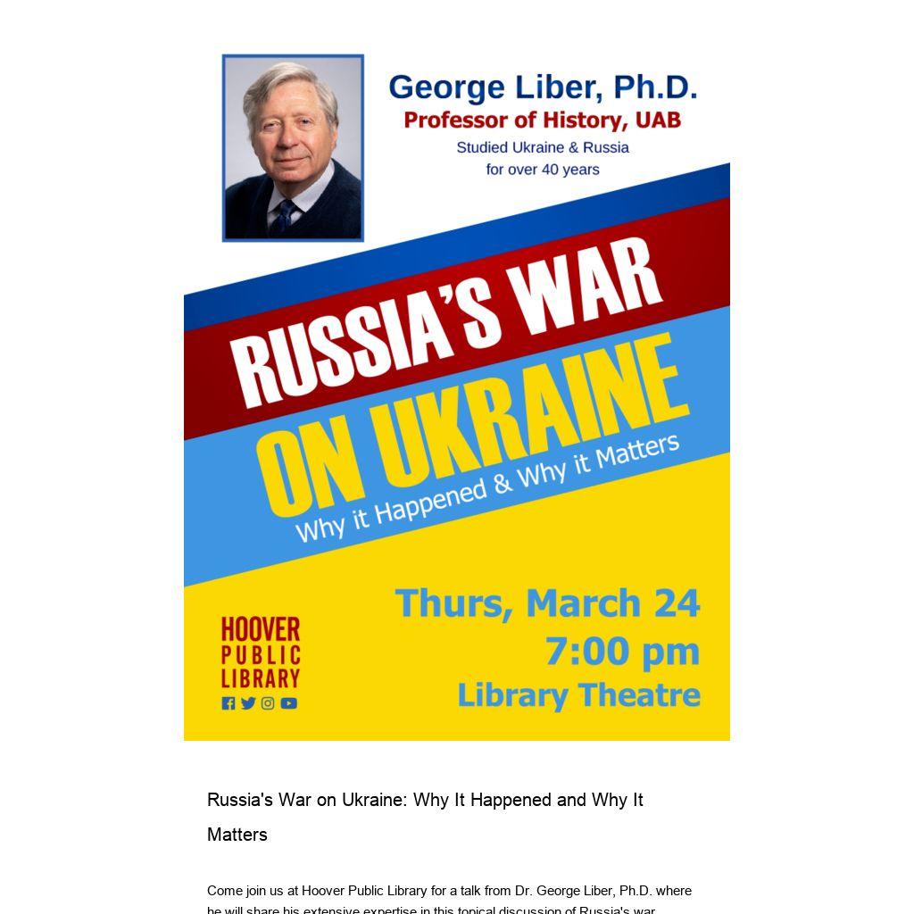 Come join us at Hoover Public Library for a talk from Dr. George Liber, Ph.D. where he will share his extensive expertise in this topical discussion of Russia's war on Ukraine. Dr. Liber has spent his entire academic career not only studying but travelling in this area of the world, and will share insights he has gained over the last 40 years.