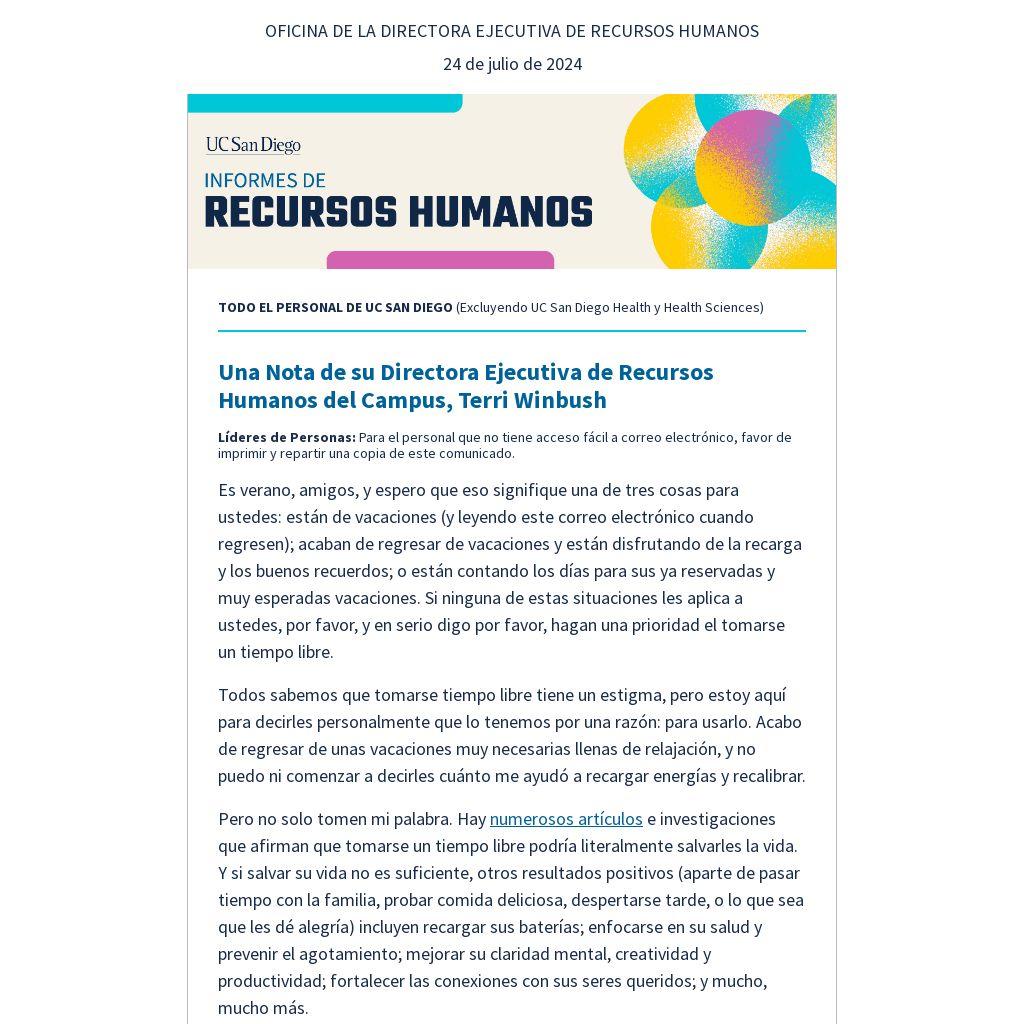 ¿Están interesados en oportunidades adicionales para explorar recursos, curar ideas y estrategias, y conectarse con otros líderes de personas? Consideren asistir a uno de nuestros próximos entrenamientos de liderazgo de personas. Los puntos destacados incluyen: Supervisión en UC San Diego (agosto), Construcción de Equipos: Establecimiento de Normas, Objetivos y Expectativas (septiembre), y Laboratorio de Entrenamiento de Supervisión (octubre). Consulten el calendario del Programa de Desarrollo de Líderes de Personas 2024 para obtener descripciones e información de inscripción.