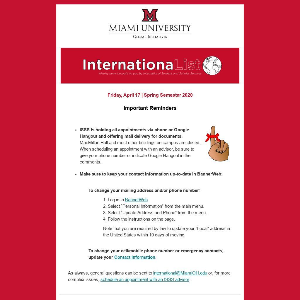 Are you looking to distribute information about your event, program, group, etc. to international students and scholars at Miami? Submit an ISSS communications request.