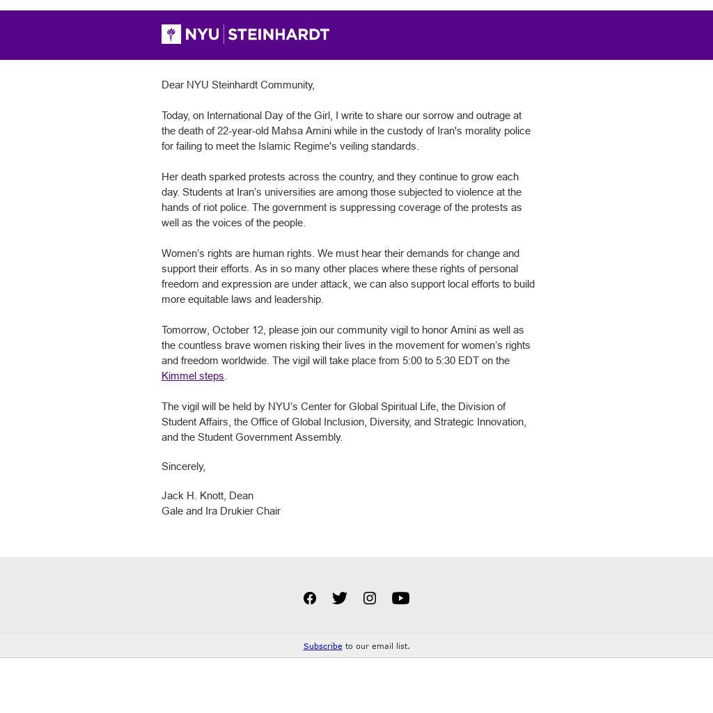 Tomorrow, October 12, please join our community vigil to honor Amini as well as the countless brave women risking their lives in the movement for women’s rights and freedom worldwide. The vigil will take place from 5:00 to 5:30 EDT on the Kimmel steps.