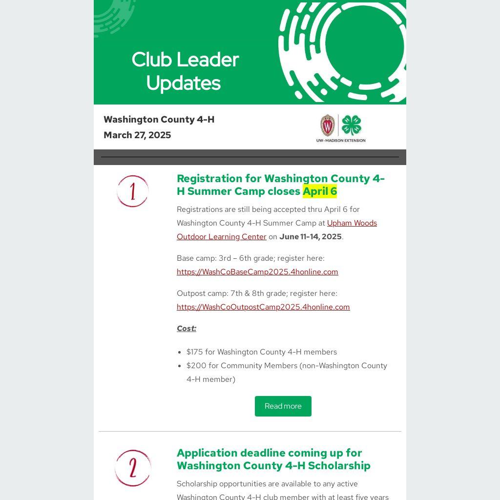 If you want any of your club events listed on the Washington County 4-H calendar, just let us know! You can email Karen at karen.girard@wisc.edu or call 262-335-4478