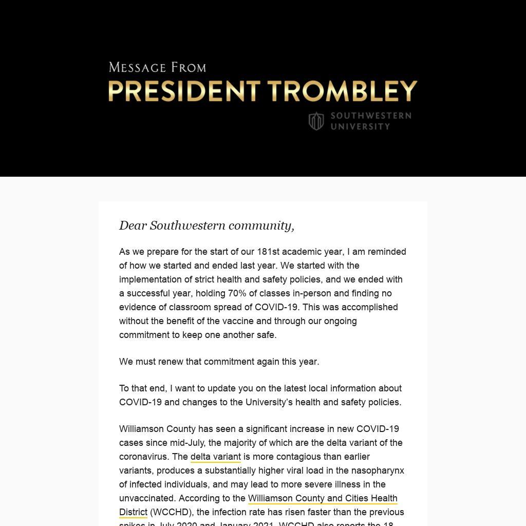 As we prepare for the start of our 181st academic year, I am reminded of how we started and ended last year. We started with the implementation of strict health and safety policies, and we ended with a successful year, holding 70% of classes in-person and finding no evidence of classroom spread of COVID-19. This was accomplished without the benefit of the vaccine and through our ongoing commitment to keep one another safe.