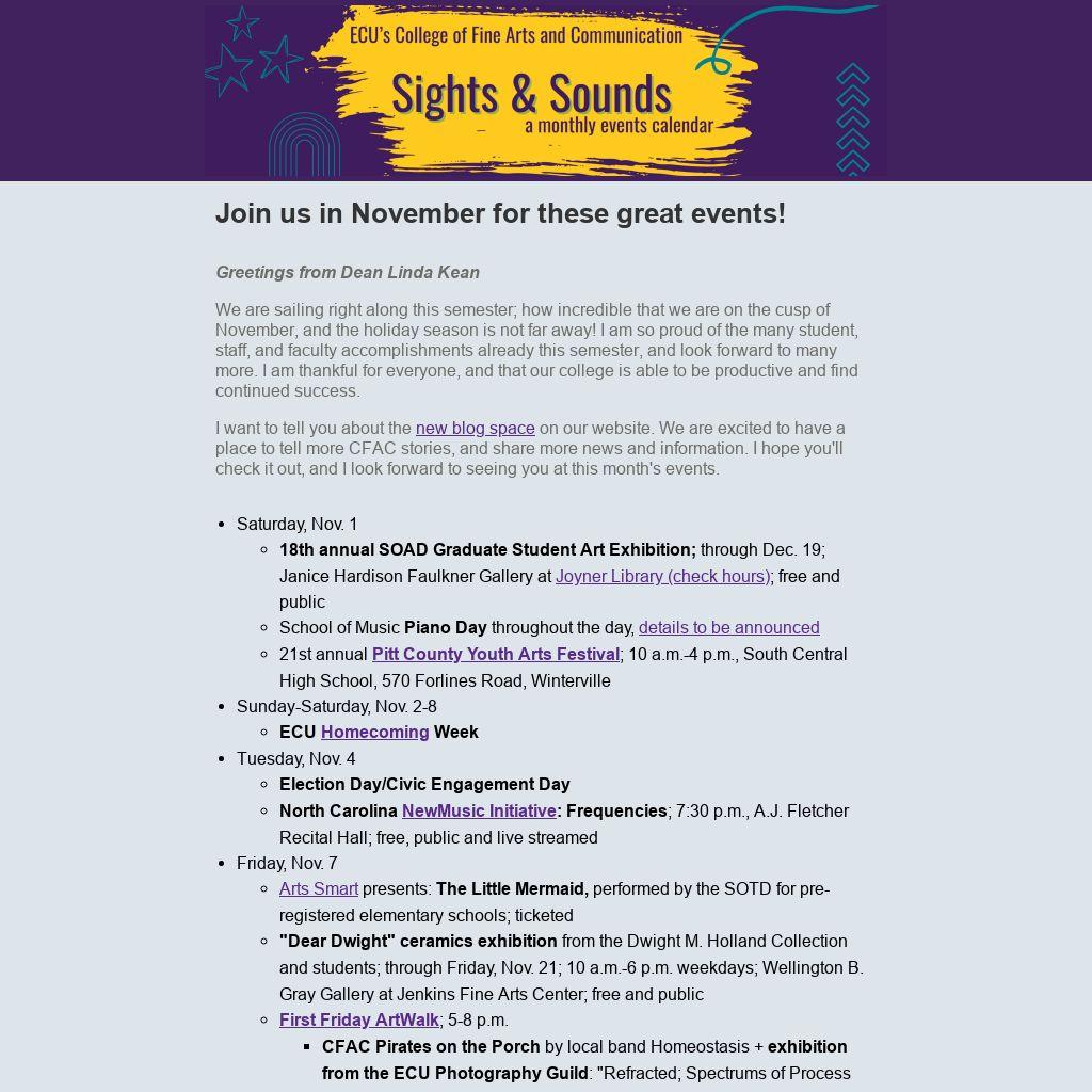 This is a monthly listing of events from the ECU College of Fine Arts and Communication as we know it at the time of distribution.